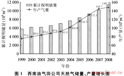 川渝地區(qū)天然氣工業(yè)始于20世紀(jì)50年代。1999年中國(guó)石油重組改制并在境外上市,西南油氣田公司(以下簡(jiǎn)稱公司)負(fù)責(zé)川渝地區(qū)天然氣勘探開發(fā)業(yè)務(wù)。經(jīng)過(guò)10年(1999~2009年)的艱苦奮斗,天然氣勘探屢獲重大突破,儲(chǔ)量快速增長(zhǎng),天然氣開發(fā)成果卓著。新建產(chǎn)能120×108m3/a(超過(guò)過(guò)去20年的建設(shè)總量),地面輸配氣能力達(dá)200×108m3/a,天然氣凈化能力達(dá)146×108m3/a,2004年天然氣產(chǎn)量突破100×108m3,2006年油氣當(dāng)量突破一千萬(wàn)噸大關(guān),成為國(guó)內(nèi)首個(gè)以天然氣生產(chǎn)為主的千萬(wàn)噸級(jí)大油氣田。天然氣產(chǎn)量從1999年的75×108m3上升到2008年148×108m3,翻了近一番,年均增長(zhǎng)10%(如圖1)。10年累計(jì)生產(chǎn)天然氣1060×108m3,占近50年總計(jì)產(chǎn)量的39%,天然氣開發(fā)實(shí)現(xiàn)了跨越式大發(fā)展。