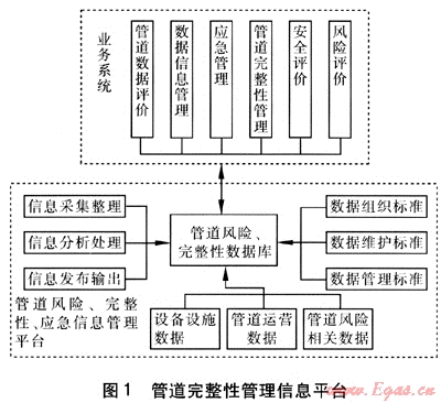 管道完整性管理信息平臺(tái)根據(jù)相關(guān)的數(shù)據(jù)組織、維護(hù)、管理標(biāo)準(zhǔn)建立管道風(fēng)險(xiǎn)、完整性數(shù)據(jù)庫(kù),同時(shí)具備信息的采集整理、分析處理和發(fā)布輸出功能。數(shù)據(jù)庫(kù)包括設(shè)備設(shè)施數(shù)據(jù)、管道運(yùn)營(yíng)數(shù)據(jù)和管道風(fēng)險(xiǎn)相關(guān)數(shù)據(jù)。管道業(yè)務(wù)系統(tǒng)包括管道數(shù)據(jù)評(píng)價(jià)、數(shù)據(jù)信息管理、應(yīng)急管理、管道完整性管理、安全評(píng)價(jià)、風(fēng)險(xiǎn)評(píng)價(jià)等子系統(tǒng),通過(guò)GIS共享管道風(fēng)險(xiǎn)、完整性數(shù)據(jù)庫(kù),實(shí)現(xiàn)信息的共享、交互、集成。由于管道完整性管理系統(tǒng)是個(gè)較復(fù)雜的系統(tǒng),一方面必須從技術(shù)層面上進(jìn)行信息數(shù)據(jù)的分析、資源優(yōu)化分析處理、信息輸出來(lái)實(shí)現(xiàn)空間數(shù)據(jù)的共享、融合,另一方面須建立一套完整的風(fēng)險(xiǎn)、完整性與應(yīng)急數(shù)據(jù)組織標(biāo)準(zhǔn)、數(shù)據(jù)維護(hù)標(biāo)準(zhǔn)、數(shù)據(jù)管理標(biāo)準(zhǔn)來(lái)保證系統(tǒng)平臺(tái)的正常運(yùn)行。只有經(jīng)過(guò)技術(shù)層面和體制層面的整合,在合理的范圍內(nèi)實(shí)現(xiàn)信息和資源的充分共享,才能使天然氣管道完整性管理系統(tǒng)達(dá)到最大的使用效益。