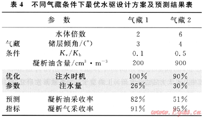 通過(guò)上述對(duì)凝析氣藏不同的注水方案結(jié)果進(jìn)行的統(tǒng)計(jì)分析,明確了不同參數(shù)和因素對(duì)于凝析氣藏注水開發(fā)效果的影響。之后可以得出不同條件下的凝析氣藏注水開發(fā)的最優(yōu)方案,并對(duì)其凝析油氣的采收率進(jìn)行預(yù)測(cè)。筆者以兩種不同條件下的凝析氣藏為例,給出了最優(yōu)注水開發(fā)方案的設(shè)計(jì)參數(shù)及預(yù)測(cè)指標(biāo)(表4)。