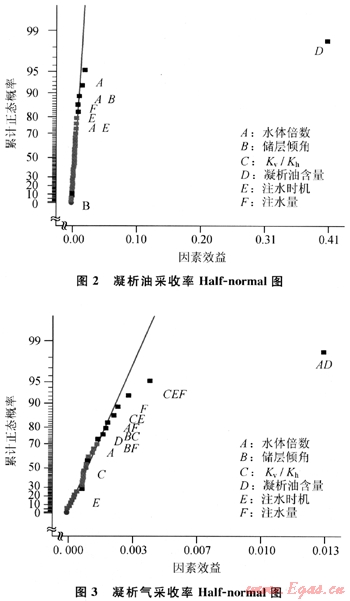 通過(guò)對(duì)以上實(shí)驗(yàn)設(shè)計(jì)得到的不同水驅(qū)方案的凝析油、氣采收率指標(biāo)進(jìn)行統(tǒng)計(jì)分析,可以繪出它們相應(yīng)的Half-normal圖(圖2、圖3)。