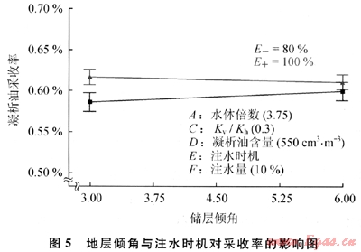 圖2為本次研究給定的氣藏條件和流體性質(zhì)情況下6個(gè)因素中對(duì)于凝析油的采收率指標(biāo)的Half-normal圖件,由它可以看出對(duì)于凝析油采收率不同因素影響的重要性程度由高到低依次為:凝析油含量、底水的體積、底水體積與地層傾角的交互作用、注水量、注入時(shí)機(jī)等。