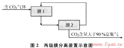 膜分離法是利用某些聚合材料制成的薄膜對不同氣體具有不同滲透率來選擇分離氣體的。膜分離的驅(qū)動力是膜兩側(cè)的壓差,在壓差條件下,滲透率高的氣體組分優(yōu)先透過薄膜,形成滲透氣流,滲透率低的氣體則在薄膜進氣側(cè)形成殘留氣流,兩股氣流分別引出從而達(dá)到分離的目的[21]。適用于CO2分離的膜材料為乙酸纖維、聚砜、聚酰胺等,由于膜本身或膜組件的其他材料耐熱性能差,150℃是其操作溫度的上限。近年來一些性能優(yōu)異的新型膜材質(zhì)正不斷涌現(xiàn),如聚酰亞胺膜、聚苯氧改性膜、二胺基聚砜復(fù)合膜、含二胺的聚碳酸酯復(fù)合膜、丙烯酸酯的低分子含浸膜等均表現(xiàn)出優(yōu)異的C02滲透性。最近也有一些硅石、沸石和碳素?zé)o機膜的研制,但均存在使用溫度高、成本高,長期運行可靠性差等問題。圖2為兩級膜分離富集CO2流程圖。