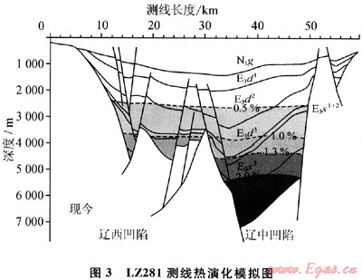 遼東灣地區(qū)有多個(gè)次級(jí)構(gòu)造帶,各凹陷烴源巖的演化程度有較大差異。為了進(jìn)一步揭示和刻畫其演化差異,在單井模擬的基礎(chǔ)之上,結(jié)合以往研究成果,從該區(qū)選擇了10條二維剖面(圖1),應(yīng)用EASY%Ro模型進(jìn)行埋藏史、熱史和成熟度演化史模擬。以測(cè)線LZ281剖面成熟度演化史模擬為例(圖3),模擬結(jié)果表明:整體來看,對(duì)于同一層位來說,與遼中凹陷相比,遼西凹陷的熱演化程度較低。遼東灣的生烴門限約為深度2500m(Ro>0.5%),遼中凹陷東二下段和遼西凹陷的東三段烴源巖進(jìn)入生烴門限。遼東灣地區(qū)的排烴高峰(0.8%<Ro<1.0%)為深度3400~3600m,遼中凹陷東三段下部及沙一、二段烴源巖和遼西凹陷沙三段烴源巖處于排烴高峰階段,產(chǎn)生大量液態(tài)烴。深度超過4400m處,遼中凹陷大部分沙三段烴源巖進(jìn)入高成熟階段(Ro>1.3%),以生成凝析氣、濕氣為主;沙四段烴源巖Ro>2.0%,進(jìn)入過成熟階段??梢?,現(xiàn)今遼西凹陷東三段-沙三段主力烴源巖主要處于生、排烴高峰,生成大量油氣,是目前遼西凹陷及其周圍地區(qū)內(nèi)一系列大中型油氣田發(fā)現(xiàn)的物質(zhì)基礎(chǔ);而遼中凹陷熱演化程度較高,除東下段和沙一二段烴源巖還處于生油階段,沙三段烴源巖主要處于生氣階段,是遼中凹陷和遼西低凸起發(fā)現(xiàn)大規(guī)模凝析氣田和油田的物質(zhì)基礎(chǔ)。