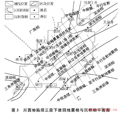 從研究區(qū)東南部的簡陽一帶往西北,地震剖面顯示厚度變大,波組連續(xù)性變好,表明由東南向西北水體變深,沉積環(huán)境由三角洲前緣向湖海相變化的特征。