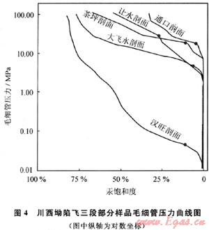 對上述8個剖面(圖1)的飛三段35個砂屑鮞粒結(jié)構(gòu)石灰?guī)r(白云巖)樣品的孔隙度進行了測試。結(jié)果顯示,孔隙度平均值為2.39%(圖3),高于四川盆地碳酸鹽巖有效儲集巖評價標(biāo)準(zhǔn)的孔隙度下限值(下限值為2%,參照SY/T 6110-2002碳酸鹽儲集巖級別劃分和四川碳酸鹽巖儲集巖分類方法),暗示該區(qū)飛三段砂屑鮞粒碳酸鹽巖為重要的潛在儲集巖。然而,孔隙度范圍變化較大(0.18%~16.98%),顯示樣品的非均質(zhì)性較強,如北段南部通口等剖面的砂屑鮞粒碳酸鹽巖孔隙度平均值多低于1%(圖3),孔隙結(jié)構(gòu)為小孔微喉或微孔微喉型組合,毛細(xì)管壓力曲線特征顯示出細(xì)-極細(xì)歪度,分選差極差(圖4),顯微鏡下觀察也顯示,這些剖面樣品的亮晶方解石膠結(jié)作用非常發(fā)育,應(yīng)是孔隙度降低的重要原因;而在漢旺剖面飛三段上亞段,見有粒間溶孔發(fā)育的鮞粒白云巖,孔隙度最大值可達(dá)16.71%,孔隙結(jié)構(gòu)為大孔中粗喉,毛細(xì)管壓力顯示出略粗歪度,分選差的特征(圖4),可能為不均勻溶蝕作用的結(jié)果;南段大飛水剖面的4個樣品孔隙度平均為8.23%(圖3),巖性為重結(jié)晶殘余砂屑鮞粒細(xì)晶白云巖,孔隙類型主要為白云石晶間(溶)孔,孔隙結(jié)構(gòu)為中孔細(xì)喉,毛細(xì)管壓力曲線顯示出分選好,細(xì)歪度的特征(圖4),儲集性能為中等-差。