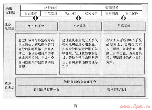 重慶燃?xì)饧瘓F隨需應(yīng)變的智慧化管網(wǎng)平臺建設(shè)以科學(xué)發(fā)展觀為指導(dǎo),遵循“高效、科學(xué)、均衡、安全”的天然氣資源配置方針,以信息技術(shù)和自動化技術(shù)為支撐,建設(shè)基于網(wǎng)絡(luò)的智能化識別、定位、跟蹤、監(jiān)控的輸配管網(wǎng),以輸配管網(wǎng)數(shù)據(jù)采集與監(jiān)視控制系統(tǒng)(SCADA系統(tǒng))、地理信息系統(tǒng)(GIS系統(tǒng))、仿真系統(tǒng)為一體的管網(wǎng)資源信息管理平臺,達到管網(wǎng)運行管理的智慧化,支持科學(xué)決策,實現(xiàn)滿足社會經(jīng)濟發(fā)展需要、滿足企業(yè)社會責(zé)任需要、滿足客戶需要、滿足企業(yè)戰(zhàn)略發(fā)展需要的隨需應(yīng)變、高效合理的天然氣資源配置目標(biāo),不斷提高資源利用效率,實現(xiàn)多方共贏。