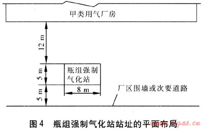 總?cè)莘e小于4m3的瓶組強(qiáng)制氣化站站址的平面布局見(jiàn)圖4。