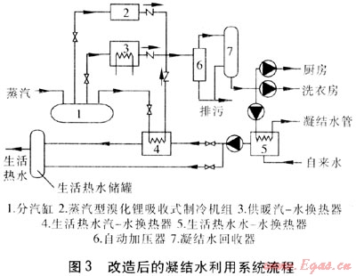 ③ 冬季蒸汽凝結(jié)水溫度達(dá)到90℃以上,且凝結(jié)水量較大,僅供給洗衣房使用是不合理的,還可以用于加熱生活熱水、廚房洗滌用水等,這樣將節(jié)省大量能源。改造后的凝結(jié)水利用系統(tǒng)流程見(jiàn)圖3。經(jīng)供暖汽-水換熱器、生活熱水汽-水換熱器換熱后的高溫凝結(jié)水經(jīng)單向閥流向自動(dòng)加壓器,經(jīng)加壓后送往凝結(jié)水回收器中,然后送到廚房、洗衣房以及生活熱水水-水換熱器中制備生活熱水。當(dāng)生活熱水需求量較小時(shí),可單獨(dú)采用生活熱水水-水換熱器,需求量較大時(shí)可同時(shí)采用兩臺(tái)換熱器。