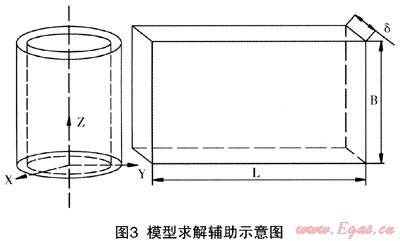 將問題簡化為等截面直肋導(dǎo)熱問題后,為便于求解,首先需確定直肋的高度、寬度、厚度、周邊長度及橫截面積。將鋼管沿著軸向垂直剖開后,變成以管周長(L)為寬,以管長(B)為高度,以管道壁厚(δ)為長度的直肋模型,如圖3所示。