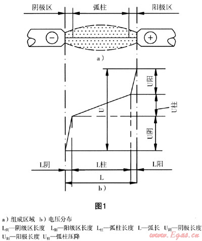 焊接電弧在其軸線方向由陰極區(qū)、陽極區(qū)和弧柱3部分所組成,見圖1。