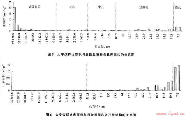 在煤層氣排采過程中,當儲層壓力、水產(chǎn)量處于連續(xù)穩(wěn)定下降階段時,氣產(chǎn)量仍然呈現(xiàn)出較大的波動,其影響因素是煤層氣的解吸特征,最終受控于煤的孔徑結(jié)構(gòu)。煤中顯微裂隙(壓汞孔徑D>10000nm)和各孔徑(大孔:1000nm<D<10000nm;中孔:100nm<D<1000nm;過渡孔:10nm<D<100nm;微孔D<10nm)的比容積、比表面積的分布是不連續(xù)的(圖5、6),比容積主要分布在顯微裂隙、過渡孔和微孔中,比表面積則以微孔和過渡孔占絕對優(yōu)勢(表1、2)。在煤層氣的解吸過程中,當解吸到某一孔徑段時,因孔容、孔表面積的變化導(dǎo)致產(chǎn)氣速率變化,氣產(chǎn)量也呈現(xiàn)波動(盡管氣產(chǎn)量是一個綜合效應(yīng),當解吸到某一優(yōu)勢孔徑時氣產(chǎn)量仍然會呈現(xiàn)出強勢)。