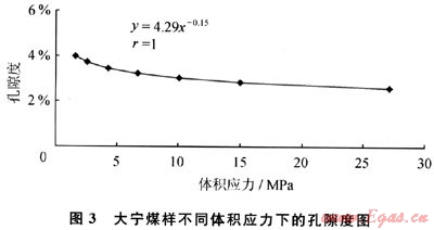 QNDN1井3#煤層埋深184m,由式(6)、(7)計算體積應(yīng)力(三向主應(yīng)力的平均值)為2.82MPa,由式(5)得φH=3.67%。