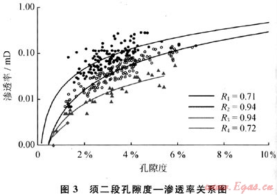 眾所周知,滲透率的大小主要取決于孔隙度的大小和孔隙的幾何形狀,通過對(duì)須二段大量的鑄體薄片觀察分類后,建立了與微裂縫發(fā)育程度有關(guān)的孔隙度與平均滲透率之間的關(guān)系(圖3),其中滲透性最好的是由黑色曲線代表,綠色曲線表示最為致密,橙紅色曲線表示在顯微鏡下可見孔隙連通性較差,未見或有極少微裂縫,喉道發(fā)育差;藍(lán)色曲線則代表有少許喉道或微裂縫連通,將測(cè)井曲線與之進(jìn)行綜合標(biāo)定后,可計(jì)算得到不同孔隙結(jié)構(gòu)及裂縫發(fā)育程度下的地層滲透率。