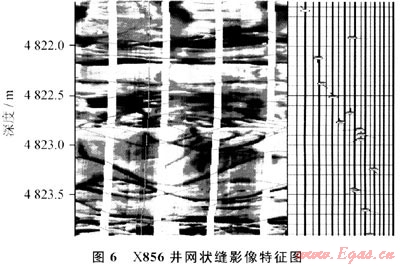 按聲電成像測(cè)圖像顏色的深淺,可以直觀、清晰地拾取裂縫發(fā)育的條數(shù)和裂縫的傾角,這是最有力的裂縫識(shí)別手段。通常成像測(cè)井分辨裂縫的類型有:高角度縫、低角度縫、網(wǎng)狀縫3大類,同時(shí)可以直觀顯示其有效性,圖6是X856井產(chǎn)層段裂縫成像測(cè)井圖,清楚地展示了裂縫的各類型。