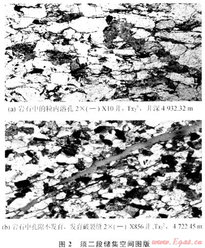 由須二段儲(chǔ)層孔隙度與滲透率的關(guān)系圖(圖1)可見,隨著孔隙度的增大滲透率有變好的趨勢(shì),但孔滲相關(guān)性較差,這說明須二段儲(chǔ)層基質(zhì)孔滲相關(guān)性較好,同時(shí)儲(chǔ)層存在一些與孔隙空間關(guān)系較小的額外滲濾通道,這些滲濾通道使得須二段滲透率值的增加對(duì)孔隙度增加的依賴很小。由薄片鑒定可推斷新場(chǎng)須二段儲(chǔ)層的額外滲濾通道為裂縫(圖2)。工業(yè)氣流的產(chǎn)出對(duì)裂縫的依賴程度很高[1~3]。