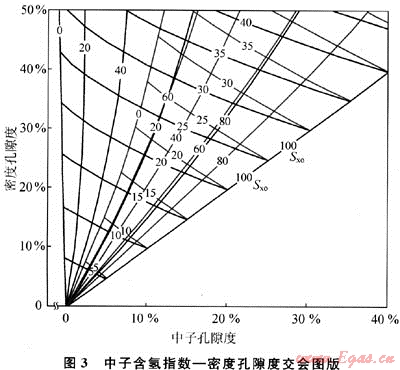 根據(jù)中子測井含氫指數(shù)和經(jīng)骨架密度校正的密度孔隙度,進(jìn)入中子含氫指數(shù)密度孔隙度交會(huì)圖版(圖3),再根據(jù)儲(chǔ)層深度選擇相應(yīng)的關(guān)系曲線族,則由交會(huì)點(diǎn)位置可得到地層孔隙度(φ)。由中子測井含氫指數(shù)及計(jì)算出的密度孔隙度,在此交會(huì)圖可查出其對應(yīng)的地層孔隙度及沖刷帶含水飽和度(Sxo)。
