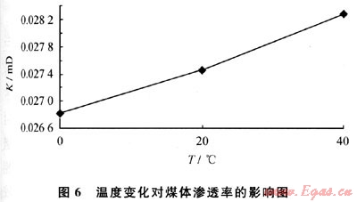 2) 實驗研究了溫度變化情況下煤體的滲流規(guī)律。結(jié)果表明,隨著溫度的升高,煤體瓦斯的滲透率升高。