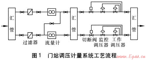 天然氣門站是城市天然氣輸配系統(tǒng)的氣源點(diǎn),應(yīng)具備過濾、調(diào)壓、計(jì)量、安全切斷、運(yùn)行路和備用路自動(dòng)切換等主要功能,確保供氣的連續(xù)性、安全性和穩(wěn)定性。為保證天然氣門站供氣的可靠性,在其計(jì)量單元和調(diào)壓單元均設(shè)有備用路[4]。門站調(diào)壓計(jì)量系統(tǒng)工藝流程見圖1。