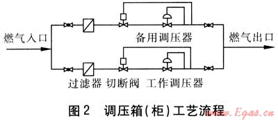 用戶調(diào)壓箱(柜)的功能是接受城市中壓管網(wǎng)來氣,并將天然氣壓力降至2500~3000Pa,輸送至庭院低壓管道供應(yīng)居民用戶使用[11]。調(diào)壓箱(柜)工藝流程(采用兩路調(diào)壓)見圖2。