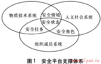 物質(zhì)技術系統(tǒng)、人文社會系統(tǒng)和組織成員系統(tǒng)3個集合的交叉構(gòu)成了3種聯(lián)系,形成安全情境、安全任務、安全角色和安全狀態(tài)4個交集。其中物質(zhì)技術系統(tǒng)與人文社會系統(tǒng)的交集構(gòu)成了管道燃氣企業(yè)所處的軟環(huán)境和硬環(huán)境,稱為安全情境。人文社會系統(tǒng)與組織成員系統(tǒng)的交集決定了管道燃氣企業(yè)中員工在安全生產(chǎn)中的身份,稱為安全角色。物質(zhì)技術系統(tǒng)與組織成員系統(tǒng)的交集劃定了組織成員在生產(chǎn)中所擔負的責任,稱為安傘任務。物質(zhì)技術系統(tǒng)、人文社會系統(tǒng)和組織成員系統(tǒng)三者的交集成為管道燃氣企業(yè)的安全狀態(tài)。安全平臺支撐體系見圖1。