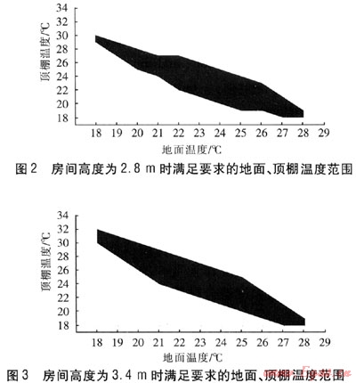對于房間高度分別為2.8、3.1、3.4、3.7m的房間模型,根據(jù)模擬結(jié)果,求出0.5、1.8m斷面上平均PPD,將滿足要求的地面、頂棚溫度點(diǎn)繪成圖形。其中,2.8m、3.4m高房間的溫度范圍見圖2。