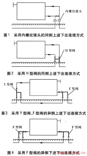 散熱器連接方式推薦采用以下4種:a.同側(cè)上進(jìn)下出(見(jiàn)圖1),塑料管出地面后,采用內(nèi)螺紋接頭與地面上鍍鋅鋼管連接,安裝簡(jiǎn)單,造價(jià)低,出地面只有一處,工程中經(jīng)常采用。b.同側(cè)上進(jìn)下出(見(jiàn)圖2),塑料管出地面后,采用H型閥與地面上鍍鋅鋼管連接,安裝簡(jiǎn)單,出地面只有一處,但H型閥價(jià)格高,工程中較少采用。c.異側(cè)上進(jìn)下出(見(jiàn)圖3),塑料管出地面后,采用Y型閥和F型閥與地面上鍍鋅鋼管及散熱器連接,出地面有兩處,造價(jià)高。d.異側(cè)下進(jìn)下出(見(jiàn)圖4),塑料管出地面后,采用兩個(gè)F型閥與地面上散熱器連接,出地面有兩處,造價(jià)高。