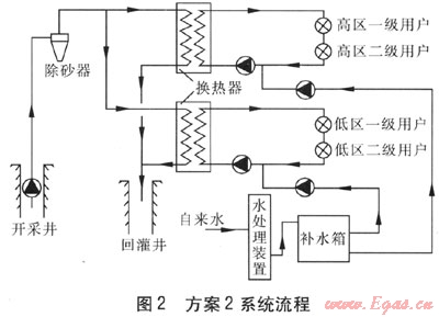 方案2,僅利用地?zé)崴?,生活熱水由電熱水器制備。建筑物分為高區(qū)、低區(qū)供暖系統(tǒng),由于地?zé)峋鏊疁囟葹?0℃,因此宜采用地板輻射供暖系統(tǒng)。為充分利用地?zé)豳Y源,熱用戶采用兩級串聯(lián)形式,以降低回水溫度,即降低地?zé)嵛菜疁囟取R患売脩艄?、回水溫度?0、40℃,二級用戶供、回水溫度為40、30℃,系統(tǒng)流程見圖2。方案2需在井口附近建1座占地面積為160m2的熱力站,地?zé)崴昧繛?41t/h,回灌溫度為33℃,總用電負荷為101kW,工程造價約265×104元。
