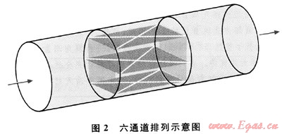 1) 與三、四聲道流量計(jì)相比,以特別方式排列的六聲道超聲波流量計(jì)有以下的決定性優(yōu)點(diǎn):①抗干擾性。根據(jù)高斯-切比雪夫(Gauss-Chebyshev)理論排列聲道,并且聲道相互交叉,使流量計(jì)很大程度上不受氣體流型的影響。因此,可以不需要整流器甚至在氣體流動受到渦流、不對稱等干擾的情況下也可以實(shí)現(xiàn)高精度的測量。②冗余性。如果其中任何一個或兩個聲道失效,六聲道流量計(jì)將不會失去計(jì)量能力,失效的聲道可以通過重新復(fù)值來得到恢復(fù)。