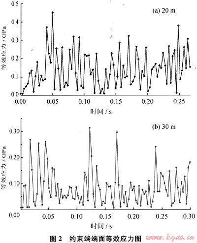 從20m和30m的射孔管柱約束端端面等效應(yīng)力數(shù)據(jù)圖看出(圖2),都存在正值的拉伸應(yīng)力,重力載荷對射孔管柱產(chǎn)生了預(yù)應(yīng)力作用,隨后應(yīng)力從正值開始降低而來回震蕩,這個階段射孔沖擊載荷對射孔管柱起作用了。20m射孔管柱模型計算結(jié)果的等效應(yīng)力的最小值σmin=6.98MPa,最大值σmax=449.92MPa;而30m射孔管柱模型計算結(jié)果的等效應(yīng)力最小值σmin=6.81MPa,最大值σmax=311.98MPa。