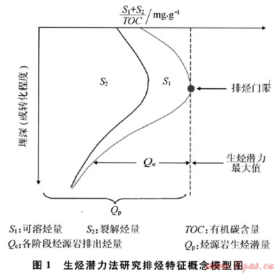 排烴門限理論在逐步完善和發(fā)展中,逐漸形成了利用生烴潛力來研究排烴門限計(jì)算排烴強(qiáng)度及排烴量的方法。生烴潛力法是根據(jù)烴源巖中的有機(jī)質(zhì)在生排烴前后質(zhì)量不變的原理,依照烴源巖的生烴潛力在沉積剖面上的變化規(guī)律來研究烴源巖排烴特征的一種方法。利用烴源巖熱解資料采用一個(gè)綜合熱解參數(shù)——生烴潛力指數(shù)[(S1+S2)/T0C]來表征烴源巖的生烴潛力。沒有油氣排出時(shí)烴源巖的生烴潛力稱為原始生烴潛力;油氣排出后,生烴潛力逐漸減小,稱此時(shí)的生烴潛力為剩余生烴潛力。烴源巖的生烴潛力指數(shù)在演化過程中開始減小,表明有烴類大量排出,而開始減小時(shí)的埋深條件代表了烴源巖的排烴門限,此時(shí)的生烴潛力指數(shù)為烴源巖的最大生烴潛力指數(shù)。烴源巖最大生烴潛力指數(shù)與剩余生烴潛力指數(shù)的差值為排烴率(qe),即烴源巖達(dá)到排烴門限后單位有機(jī)碳排出的烴量(mg/g);Qe代表了烴源巖在地質(zhì)熱演化史過程中累積排出的烴量(圖1)。