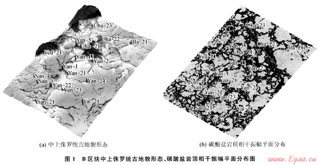 古地貌是控制一個(gè)盆地后期構(gòu)造與沉積特征的主要因素,對(duì)沉積體系內(nèi)的儲(chǔ)層發(fā)育與分布以及油氣藏的富集具有一定的控制作用。通過古地貌恢復(fù)技術(shù)與三維可視化技術(shù)相結(jié)合,可以從空間角度分析古地貌對(duì)鹽下礁體的控制作用。由于本區(qū)上覆膏巖、鹽巖與碳酸鹽巖速度的差異,極易形成強(qiáng)的巖性界面。另一方面,礁體發(fā)育區(qū)特別是含氣后,速度降低,波阻抗差減小,振幅也會(huì)降低;而礁間帶致密石灰?guī)r儲(chǔ)層,連續(xù)性好、振幅強(qiáng),而因利用振幅屬性能較好的預(yù)測(cè)礁體發(fā)育區(qū)。相干屬性對(duì)地層的不連續(xù)性特別敏感,可以識(shí)別斷裂、裂縫的分布范圍。將古地貌與相干振幅屬性相結(jié)合,可以更好的預(yù)測(cè)礁體的平面分布。圖1-a是研究區(qū)B區(qū)塊楊古伊-恰什古伊氣田碳酸鹽巖沉積時(shí)的古地貌,鉆井證實(shí),生物礁發(fā)育于古地貌較高部位。從圖1-b的相干振幅平面分布圖可以看出,生物礁發(fā)育部位相干性差、振幅為中低振幅,裂縫較為發(fā)育,儲(chǔ)層物性較好,與古地貌隆起區(qū)的分布一致。利用古地貌與相干振幅屬性相結(jié)合,在斜坡相帶已發(fā)現(xiàn)了楊古伊氣田和恰什古伊氣田。鉆井證實(shí),斜坡帶的點(diǎn)礁群是擴(kuò)大B區(qū)塊探明儲(chǔ)量的有利地區(qū)。