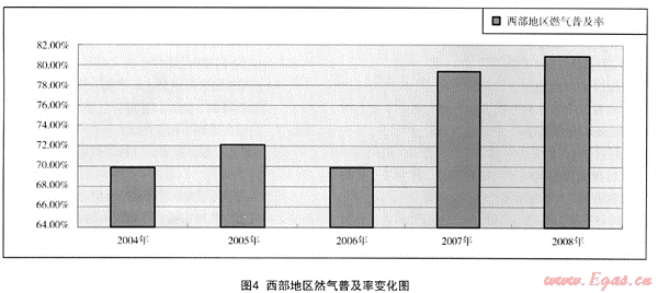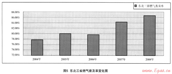 (2) 區(qū)域的燃?xì)馄占奥什⒉荒芡耆砀魇?、市、自治區(qū)的燃?xì)馄占奥仕?。?008年的情況看,東部地區(qū)的海南省只有73%,而中部地區(qū)的江西省燃?xì)馄占奥试?0%以上,西部地區(qū)的重慶市也在90%以上。因此,作為規(guī)劃設(shè)計(jì)的重要計(jì)算數(shù)據(jù)使用時(shí),還應(yīng)該進(jìn)行具體分析,但東部地區(qū)普及率應(yīng)該在全國(guó)的平均數(shù)以上。