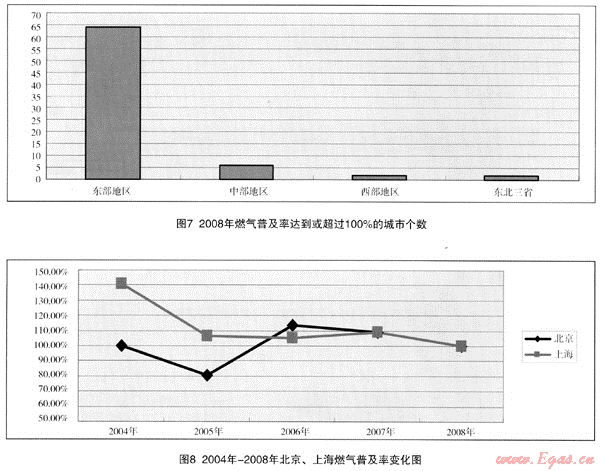 (3) 上述結(jié)論也可從以下將討論的2008年我國(guó)燃?xì)馄占奥蔬_(dá)到或超過l00%的城市狀況得出。