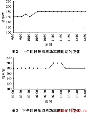 在空調(diào)模式下,工作設(shè)備主要有空調(diào)壓縮機(jī)、空調(diào)風(fēng)機(jī)、加壓風(fēng)機(jī)。在實驗過程中,測試開始后0.5h系統(tǒng)進(jìn)入穩(wěn)定階段,采用功率表測試這3個設(shè)備的功率。上下午時段空調(diào)壓縮機(jī)功率的測試數(shù)據(jù)分別見圖2、3。由圖2、3可知,在上午時段,壓縮機(jī)的最大功率達(dá)到180W,最小功率為160W。在下午時段,最大功率達(dá)到了200W,其余時段保持在180W。
