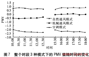 整個時段3種模式下的PMV值隨時間的變化見圖7。由圖7可知,3種模式的PMV值差別較為顯著,自然通風(fēng)模式下PMV值在0.5以上;空調(diào)模式下達(dá)到-2.0以下,偏離最佳熱舒適度的程度很大;采用機(jī)械通風(fēng)模式,上午時段的PMV平均值為-0.53,下午時段約為0,比上午時段更加接近最優(yōu)熱舒適度。