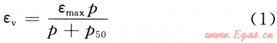 式中:εv為壓力p下吸附的體積應(yīng)變;εmax與朗格繆爾方程中朗格繆爾體積數(shù)據(jù)表達(dá)的含義相當(dāng),代表理論最大應(yīng)變量,即無(wú)限壓力下的漸近值;p50與朗格繆爾壓力數(shù)據(jù)表達(dá)的含義相當(dāng),代表煤樣達(dá)到最大應(yīng)變量的1/2時(shí)的壓力。