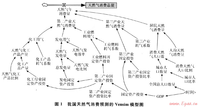 天然氣消費是一個復雜的非線性系統(tǒng),影響因素眾多。目前大多數(shù)以計量模型為基礎的預測方法只能考慮到兩到三方面的影響因素[1~6]。為了能夠更準確地預測我國天然氣消費量,本文采取系統(tǒng)動力學的方法,利用能夠考慮多因素的Vensim系統(tǒng)動力學軟件進行建模預測。在構(gòu)建天然氣消費預測模型時,從國民經(jīng)濟的產(chǎn)業(yè)結(jié)構(gòu)入手,將天然氣消費系統(tǒng)分為第一產(chǎn)業(yè)天然氣消費量、第二產(chǎn)業(yè)天然氣消費量、第三產(chǎn)業(yè)天然氣消費量以及居民生活天然氣消費量4個子系統(tǒng)。同時,考慮到整個社會的經(jīng)濟發(fā)展水平以及人口數(shù)量對天然氣消費量的直接影響,將GDP和全國人口數(shù)量作為預測我國天然氣消費量的重要因素。我國天然氣消費的系統(tǒng)動力學預測模型如圖1所示。