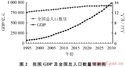 在所建立的系統(tǒng)動力學模型中,GDP與總?cè)丝跀?shù)量是預測我國天然氣消費的重要因素。在進行各個子系統(tǒng)天然氣消費預測時,必須首先掌握這兩個因素的變化規(guī)律。根據(jù)國務院發(fā)展研究中心對我國經(jīng)濟增長前景的預測以及國家人口和計劃生育委員《國家人口發(fā)展戰(zhàn)略研究報告》的基本判斷,我國GDP的總量和未來全國總?cè)丝跀?shù)量預測結(jié)果如圖2所示。為了便于計算和對比,GDP以2005年不變價格計算。
