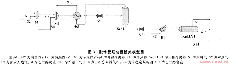 由于低溫分離器等設(shè)備處于脫水脫烴裝置的作業(yè)流程內(nèi)部,不可能在裝置運行過程中實時采樣,所以采用VMGSim軟件對脫水脫烴裝置中汞的分布進(jìn)行模擬(VMGSim軟件是目前國內(nèi)外唯一能對微量金屬元素在工業(yè)流程中的分布情況進(jìn)行模擬的專業(yè)軟件)。