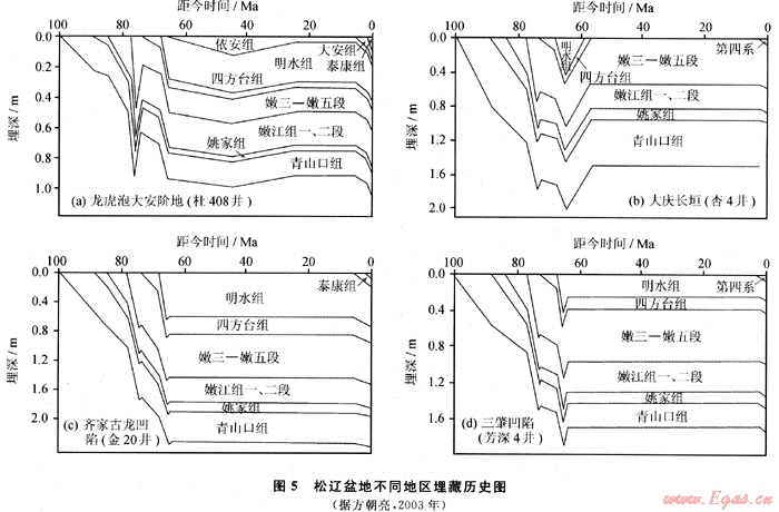 埋藏史研究結(jié)果表明,松遼盆地北部從青山VI沉積開始,不同地區(qū)的埋藏史有所差異(圖5),正是這種埋藏歷史的差異是導致松遼盆地北部油氣聚集成藏的主要動力學原因之一。