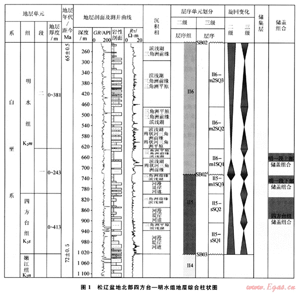 松遼盆地在演化過程中經(jīng)歷了不同的構(gòu)造運動期次,不同的期次發(fā)育不同的沉積特征,在松遼盆地晚期四方臺組和明水組總體以氧化-半還原環(huán)境為主,在平面上以廣闊的泛濫平原、淺水湖泊三角洲和濱淺湖相為主,四方臺組初期發(fā)育的泛濫平原河道可以作為有效的儲集層,另外四方臺組晚期和明水初期所發(fā)育的濱淺湖泥質(zhì)沉積可作為上覆蓋層,同時配合下伏的生油巖、斷裂輸導通道、有效圈閉和油氣運聚保存的空間配置關(guān)系,可以構(gòu)成良好的成藏組合(圖3)。