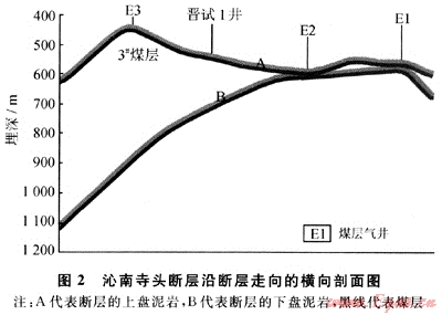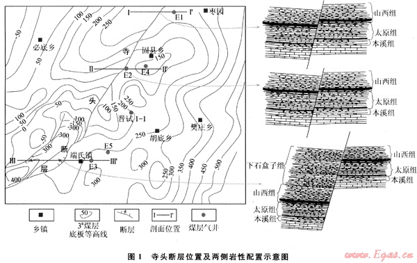 寺頭斷層位于沁水盆地東南部地區(qū),斷層走向變化較大,在端氏以北,走向為10°~25°,端氏以南變?yōu)?0°左右,傾向NW,傾角為70°~85°。斷層落差變化范圍較大,在寺頭一帶最大,超過360m,向南北兩端變小。以往研究與實際勘探資料表明寺頭斷層對其東西兩側(cè)的潘莊一樊莊煤層氣藏和鄭莊煤層氣藏的水文地質(zhì)條件j構造格局和煤層氣的賦存都具有明顯的控制作用[17~19]。因此探討寺頭斷層封閉機理對評價斷層兩側(cè)的煤層氣成藏具有重要的意義。