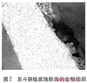 通過(guò)對(duì)鍋爐灰斗鋼板腐蝕斷面的金相組織分析(見(jiàn)圖2),腐蝕發(fā)生的機(jī)理主要是腐蝕介質(zhì)對(duì)鋼板的點(diǎn)蝕和沖蝕,由于點(diǎn)蝕和沖蝕的共同作用,使金屬表面的保護(hù)層剝離,腐蝕介質(zhì)與金屬直接接觸而發(fā)生腐蝕,含有顆粒等雜質(zhì)的高溫、高速煙氣連續(xù)不斷地直接沖擊金屬表面又進(jìn)一步造成鍋爐灰斗金屬表面的沖蝕,因此鍋爐灰斗在非常短的運(yùn)行時(shí)間內(nèi)就出現(xiàn)了穿孔失效的情況[4]。