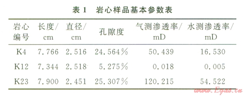 實驗樣品選取某水驅砂巖氣藏型儲氣庫儲層巖心,代表地下儲氣庫高、中、低各類滲透率級別的儲層,樣品基礎參數見表l