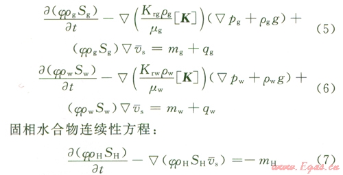 假定地層孔隙中含水、氣體和水合物三相,只有水和氣體兩相可以流動?;谶B續(xù)性方程及廣義達西定律等,得到滲流方程: