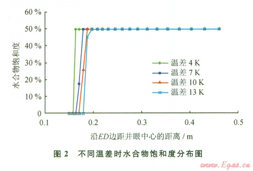 鉆井液溫度為本研究的主要因素,取工況為平衡壓力鉆井,模擬水合物地層打開l h后不同鉆井液高于地層的溫度差時井壁附近地層的水合物分解情況,結(jié)果如圖2所示??梢钥闯觯S著鉆井液高于地層的溫度差越大,井壁附近的水合物分解范圍也越大,溫差為13 K時水合物分解范圍相對4 K時增大了l4.2%。1體積的水合物完全分解可產(chǎn)生164體積的氣體[11-12],這些氣體進入井筒后將會帶來極大的風險,鉆井液受到氣侵而密度將低,進而導致鉆井液柱壓力降低,可能造成井壁的垮塌。