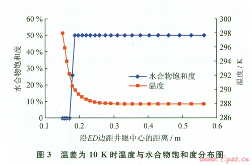 3)天然氣水合物地層鉆井過程中,由于井眼液柱壓力一般不得低于地層壓力,溫度是影響地層水合物分解的最主要的因素?;诒緮?shù)值模擬的分析,可以看出盡量控制鉆井液的溫度不高于水合物的相平衡溫度,能夠抑制井壁附近地層水合物的分解,進而有利于保持井壁的穩(wěn)定。然而,低溫又對鉆井液的流變性等性能提出了較高的要求,所以優(yōu)選出能適用于低溫環(huán)境的鉆井液體系,對提高天然氣水合物地層的井壁穩(wěn)定將有很大幫助。
