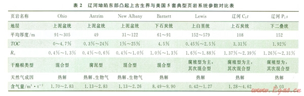 將研究區(qū)2套泥頁巖層與美國主要產(chǎn)氣頁巖層各項參數(shù)對比,結果發(fā)現(xiàn):遼河坳陷東部凸起上古生界泥頁巖地化參數(shù)較好(表2),進一步表明該區(qū)上古生界泥頁巖具備頁巖氣存在的條件,具有很好的開發(fā)潛力,可作為頁巖氣下一步要尋找的目標。