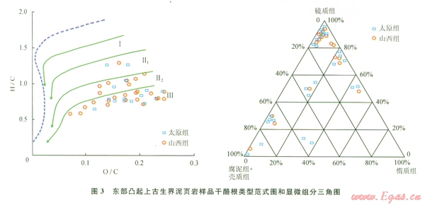對研究區(qū)上古生界典型井20塊泥頁巖樣品熱解數(shù)據(jù)的統(tǒng)計分析結果表明,太原組泥頁巖樣品主要以腐殖型為主,腐殖型干酪根比例占實驗樣品總數(shù)的78%,其次依次為偏腐殖混合型和偏腐泥混合型干酪根,干酪根偏向于生氣型。山西組有機質(zhì)以腐殖型為主,腐殖型干酪根比例占總實驗樣品的73%,其次為偏腐殖混合型干酪根。顯微組分統(tǒng)計結果顯示,上古生界泥頁巖樣品主要含鏡質(zhì)組和惰質(zhì)組,類型指數(shù)T基本都小于0,以腐殖型干酪根為主。但不論采取哪種方法,分析結果都是一致的(圖3)。
