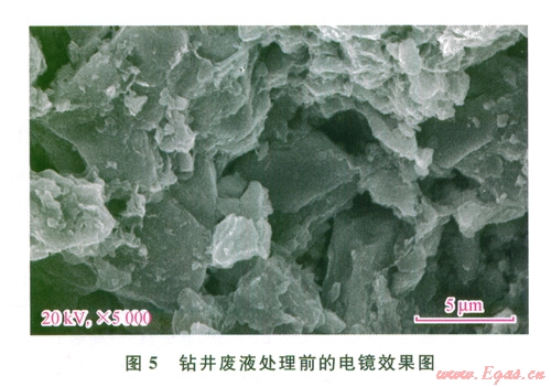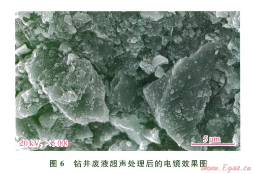 從電鏡掃面圖像分析看出,鉆井廢液處理前體系顆粒之問有明顯的有機(jī)物鏈接相互連接,顆粒表面也覆蓋了一層膠狀有機(jī)物質(zhì),使鉆井廢液體系非常穩(wěn)定,同時CODcr較高。加入混凝劑量大時才能破壞膠體,但體系中的有機(jī)污染物在性質(zhì)上沒多大變化(5);當(dāng)使用超聲波處理鉆井廢液后,電鏡圖明顯看出,鉆井液中的顆粒物質(zhì)非常疏松,顆粒之間沒有相互連接的有機(jī)物存在,實驗檢測CODcr值降低。由此可知,不但破壞了廢液膠體體系,而且有機(jī)物在超聲波作用下得到大幅度降解。因此,超聲波處理后水中的污染物濃度大大降低,主要的污染指標(biāo)達(dá)到排放一級或二級標(biāo)準(zhǔn)(6)。綜上所述,超聲波對于能夠破壞膠體穩(wěn)定性,同時其“空化效應(yīng)”產(chǎn)生的高溫高壓及自由基對水中的有機(jī)污染物、油類、重金屬、硫等具有去除作用。